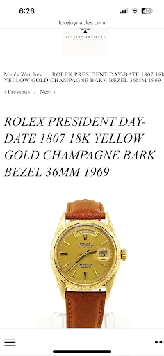 Read moreMyself and my husband have been return customers at Lovejoy for approximately the last 10 years. Ace, the owner, has done a remarkable job at always trying to please his customers with all of the stunning items that he sells at his fine store. With that being said I purchased a Pre Owned Presidential Rolex watch there for my husband that was in like new condition. It also had a 2 year warranty left from having recently been serviced by Rolex. Ace is a wonderful owner and thoroughly enjoys his fabulous store & customers as well! His store is filled with wonderful Jewlery and gorgeous Antiques as well. We have sent many of our friends there who have also purchased a Rolex watches and jewelry as well. If you're ever in Naples please make sure that you take a trip down 5th Avenue and make a visit to Lovejoys. Trust me you will definitely not be disappointed one single bit. Another thing I'd like to say is that Ace is among one of the most trustworthy owners of a store like his. We are forever grateful to Ace for always being there for us either to make a purchase or else get our jewelry fixed or our watches serviced. We will definitely be back sooner...