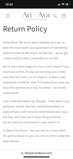 Unfortunately, I won’t be back. As a plus size Nashville native, I was soooo excited to find a local actual plus size store(other than the usual chain stores).This has absolutely nothing to do with the lady with the blonde hair. She was absolutely amazing when I came in at the last minute looking for an outfit for the baby shower I had this weekend. She helped me with the sizing of pieces and tips and tricks. I left with 3 pieces that day. I came back to initially exchange one of the pieces the next day and the lady with the brown hair was working. My Mom and I looked around trying to find something that matched one of the pieces that I kept instead but I didn’t find anything I felt matched it, so I decided to do a return instead. I had previously saw the return policy when shopping on the website before I went to see if they accept exchanges. It showed that they do offer returns of in store purchases. The cashier said they don’t accept returns and proceeded to argue the fact that they don’t, even when I told her exactly what is posted on their website. She offered to text her boss and that I could come back the next day for their response. I asked her if she could call him instead and she kept saying she texted him to ask. I told her that I don’t live close and that on the next day, I have my dialysis treatment and have to work, so I don’t have time to come all the way back there. Then she still continues with only the text to the owner. She finally gets a call back from and he I guess goes over the instructions for processing the return. She comes back over and starts the return and I’m asking “so he said we can do a return right?” She says that’s what she’s working on and confirms the order number then moves the return to the table behind her and says nothing else. I’m like usually a cashier will say how much is being returned, when it’s going back, sorry that didn’t work for you. Something! Anyways, I would definitely go over customer service skills with her if I was her manager because that’s a very quick way to lose possibly life...