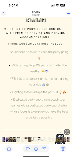 We understand our booking came during a time of transition, but never once was Kristen offered a cancellation at no charge. Notification of the change was received by text the morning of the tour, only saying no outside alcohol was allowed which was contradictory to the initial description. A phone call to explain would have went a long way. The complimentary "bucket of drinks" was asked about when we arrived and the bartenders said they didn't even offer buckets of drinks. When the owner checked in during the tour, Kristen told him how disappointed we were but were making the best of it. 90% of our tour was driving through dark, shady areas. We got a 5 minute drive through town because of event road closures, which was also not communicated. There was no interaction from the staff on the tour aside from getting a drink from the cooler or playing requested songs. When we asked about stopping the tour and letting us off, we were told it would be a $15,000 fine.