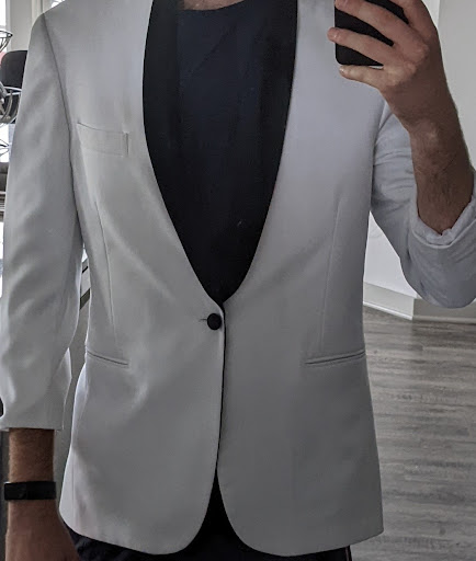 The day before I leave town for the event, Im at the store for another 30 minutes waiting to pick up my tux rental. Finally a long line starts to form, and they begin with the woman who just walked in to pick up a tux rental for her husband. She questions them and says, "has he been helped?" Pointing at me. To which I respond, not even in the slightest. They hand me my tux and say goodbye. I suggest I try it on before leaving the store. Being surprised by the child sized white jacket shown in the image, I overlooked the oversized shoes, white suspenders and lack of a bow tie in the order. They then try to gaslight me to tell me it's the dinner jacket I ordered for the grooms party I am a member of. I am not a member of a grooms party. This was an individual basic black tux with a bow tie reservation.