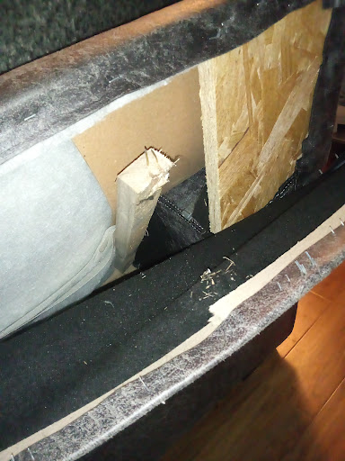 Couch has "collapsed" pretty much everywhere we have sat on regularly (we are average weight). One of these boards popped through the backing so I removed the backing to discover that everything's pretty much cheaply held together by staples and the supporting pieces of wood don't seem to be long enough which might account for why they come unstapled or untacked so easily. I actually found a random ream of staples inside the couch which is kind of funny. Anyway this thing internally is not much more than plywood and cardboard, not worth $2,500. Overall we like the sectional but I believe it's made to look less cheap than it actually is. You can tell just by touching the arms that they are made of not much more than just very thick cardboard, and the sofa is not really that great for napping on anymore due to the way it has settled and collapsed. Still, I replaced the cheap board in the back that snapped with a thick piece of real wood and it works great. If you're going to spend money on a sofa get one that has real wood inside, not plywood...