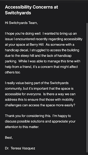 Accessibility is not a “nice-to-have” feature; it’s a basic expectation in modern businesses. Switchyards’ refusal to take actionable steps to create an inclusive environment sends a clear message that they don’t value customers who require accessible spaces. If you’re looking for a coworking space that values inclusivity, I’d strongly recommend looking elsewhere.