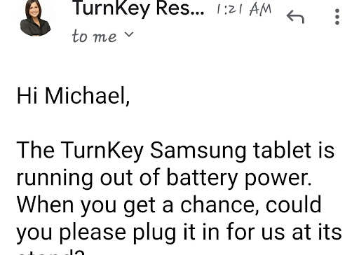 They did not contact me at all for the remainder of my trip. I did love the unit and location but will consider a different one for my next trip to Nashville, TN. There was a night we heard yelling outside from a neighbor using foul language but I won't get into detail about that as that really doesn't have to do with Turnkey and...