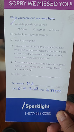 Read moreYou know, I gave them the benefit of the doubt and boy was I mistaken. I bought the service and have, like so many others, waited for the tech to show up. I called multiple times to make sure he/she knew to knock loudly because we are wiring the old house. My subcontractors and I were standing inside the door, having just walked in from looking at a the meterbase and walked back out only to see that the technician had walked up to the door, and not seeing a door bell hung a tag stating we missed the appointment. No knock; no nothing. Twas the ultimate in moronic customer service. Was as annoying as my use of "twas" in the preceeding sentence. Not only did he DATE his call-tag a month ago (today is September 21, 2023 not August 21, 2023) he also fudged his numbers, writing he had come an hour earlier at 2:18. What he/she didn't know was that between 2:09 and 2:35, I was standing on the porch, on the phone with Sparklight. He/she came after 3:00. The technicians at this location are too irresponsible in their service to the community--pure lazy. We need to meet with the city council about bringing in another cable company to provide services to the area. I immediately called and...