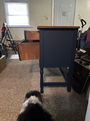 I got wife a mirror, and saw this credenza/table service piece of furniture. I asked what it was $$$? And bought it. I just liked the finish job. I thought at first it was someone taking one of those 1960's laminate dressers and just hitting it flat blue and scuffing it.