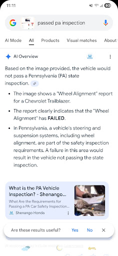 Got a joke of an inspection. Never checked a single tire all were at 30psi or under and indicated on the dash they needed air. One tire was very low. It is flat today and needs a repair. I also received an alignment report from them. IT FAILED!!!!! No one offered me an alignment to fix the safety issue.