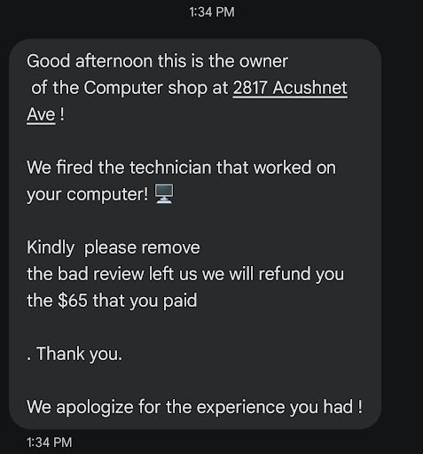 Read moreThey're nice people, just not good at their jobs. (((UPDATE AS OF JAN 22ND 2025, when i took back the pc to bring it to another repairman, it was discovered that the motherboard was NEVER the problem; and was in fact the MEMORY. These guys wanted me to fork over $300+ for something that wasnt even broken. I was then asked by the owner to remove the negative review for money, specifically $65, should've just offered a refund outright.)) Took my pc to these guys for a potential repair, $65 to find out the motherboard is shot which isn't what I'm complaining about even though that is steep, when I got my PC back from them after deciding to go with a DIFFERENT repair person they discovered that these guys didn't even put the computer back properly, nore did they have everything plugged in. (TLDR they gave me my computer back in a worse condition than it...