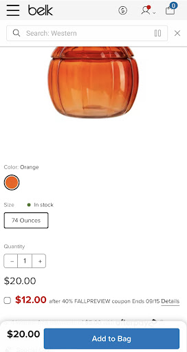 Read moreI went to this store for the first time today. All around the store there’s 40% off signs everywhere. I bought 2 pumpkin cocottes and a clear glass pumpkin jar. The cocottes were $16 ($9.60 with discount) pumpkin $20 ($12 with discount) full price. The prices are listed clear as day. I got in line to check out and I asked the cashier to please apply the 40% and she said she would. To my surprise my total came out to $46 and change when it should have been around 35ish with the three items adding up to $31.20 before tax. I asked the lady what the price was of the 74oz glass pumpkin jar and she told me it was $24 after the discount and I thought that couldn’t be right because I saw $20 on it. Now I am home and I search the product online - the same one, but an orange color one that’s available for shipping and it says the price is $12 with the original price $20. So basically this lady charged me $4 more than the full price and then proceeded to lie to my face as I was busy with 3 kiddos when the item should have been $12 after the discount. I don’t even know what she rung up because there is a sticker on the pumpkin with the price on there. Now I will have to return and get this fixed and I am not from the area. The fact that I even questioned it should have alerted her to double check. Make sure y’all check...