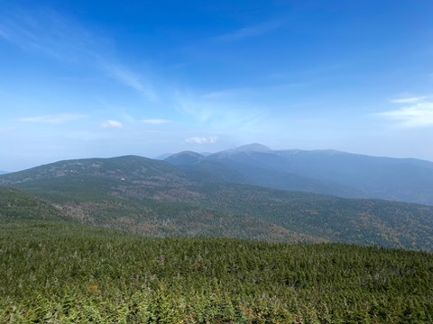The view north toward Mt. Washington is excellent, though late season Canadian fires obscure these shots a bit... Watch your lunch as the camp robber (Canadian Gray Jay) will go for any food left briefly unattended. Hold a bit of granola in your hand and you may be lucky enough to get one to eat from it. ...