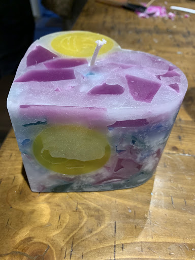 The owners are friendly, the studio was pretty and the space smelled divine! My 9 year old son decided to make a humungous chocolate layered cake with vanilla scent and I build a mason jar candle with black jasmine custom scent. We came up with a design & look and the whole process was very therapeutic. My favorite part of the candle making process was breaking the slabs of wax into pieces to fill up the container. It took a lot longer to fill up my son's candle container, because it was so big! I was given an option of decorating the tops of my mason jar candle with real flowers and I decided to go with dainty little rose buds.