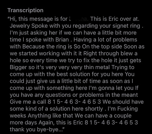 Read morePLEASE don’t get your jewelry engraved here! Brought in a ring to get it engraved. It was a very sentimental piece passed down from my grandmother with her request decided to get a letter E engraved. I understood that it was a thin gold ring so I said if you can’t do it then please call me and I will pick up my ring asap. He said no if that machine can’t do it we will free hand it. We picked out a font told me to give them a week and I left. A week and a half went by and didn’t receive a call so I called. The man on the phone was super nervous and said he would call me back I told him I would be at work and to please leave a VM. (I will attach a photo of the horrible VM) 3 days later I got the it’s ready call…. when I went to pick it up I wanted to scream the originality of the ring was GONE because of how bad they messed it up. I remained silent while looking at my ring. I paid and while the man (not sure if his name was Brian or Eric) was charging my card. he proceeded to say “you know we did a lot more work than $55 on this ring, you wouldn’t be able to find another jewelry store to do this.” You “BLEW A HOLE IN IT” so of course you put more money into. I remained quiet until I got to the door and reminded him that it was a sentimental piece and what he said was ABSOLUTELY WRONG. I left really upset. I thought because it was family owned business that I would receive ATLEAST an apology phone call and I received nothing. This...