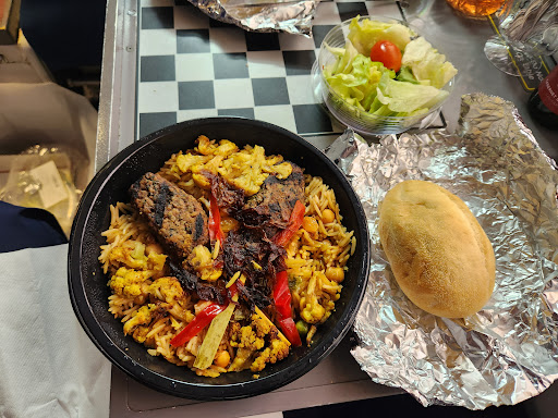 mild curry taste with sweet undertones from the raisins and carmelized onions kebab was meaty; not beyond or impossible-like, but flavorful (grilled taste) and great texture roll was warm, soft, and chewy meal comes with two dairy butter pats and two dairy ranch dressing packets