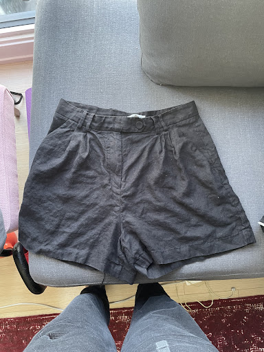 I tried on: -Organic Cotton T-shirt in Black -Silk Button-down in Burgundy -Leather Shorts in Black