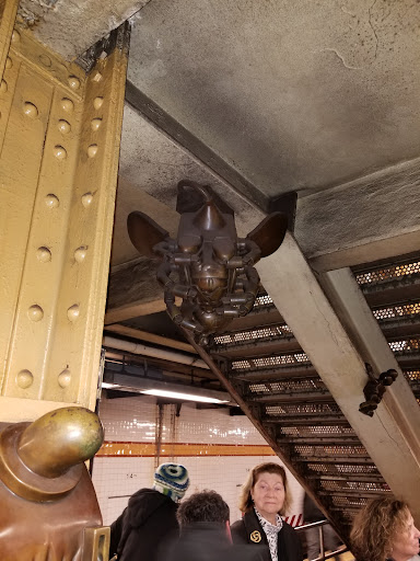 As I was going down the stairs onto the uptown train platform, I could not help but notice an amazing little bronze sculpture sitting on the high beams. Of course I immediately begun photographing. Then at the bottom of the steps I saw a train guide and I asked him how long the little sculpture had bee there?