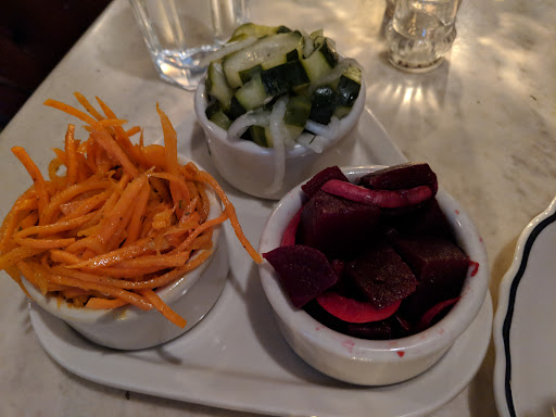 Very dark. It's dark on the stairway up, and it's dark in the lounge itself. The darkness is a bit disorienting during the day, but the ambiance really works here. There's a bar, a seating area with a dozen small tables and what looks like a private room in the back. It was closed, so I don't know what it's like inside. Gotta upgrade to VIP, I guess. I got a Maya Made cocktail and it was very simply presented. The drink was very nice, though I'm not sure I would get it again. It probably doesn't need the cilantro for my tastes. The deviled eggs are some of the best I've had, and could eat several orders by myself. There's pastrami in there and it's perfect. The dry aged salami is also unreal. Quite possibly the best dish there, and one of my favorites ever. The flavors are all very complimentary, and the texture of the salami on the bread with the aioli is amazing. I want more. Every day. I was less impressed with the pickle trio. It was good, but standard and I may have been expecting another "wow" dish. We also received a complimentary Kugel dish that was nice. Different. I don't recall all the flavors, but I didn't leave any leftover. I'll be...