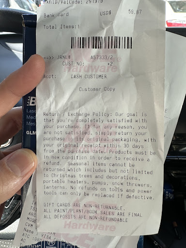 Read moreI have being buying all supplies i need for home and for work here for 3 years… they have basic things you need so usually i buy take a look here before ordering on amazon… i need to replace a pice and i brought it to but a exact but they didn’t have it, they had a similar one. the person in the cashier asure me the one they had was going to fit what i need but if it didn’t i could get a redound with not problem, he was very nice and polite so i bought 8 of those pieces… They didn’t work and i went to get my refund and there was someone else and who didn’t like my request and just give me a bad look, and he just seems upset and there was no more the gentle and nice customer service that I used to get there … of curse they took 15% for restocking fee… something i wasn’t told at the beginning….anyway the worst part was the attitude.. so i think i...