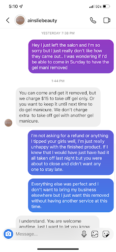 Read moreI’ve been going to this salon since they’ve opened their location. Very clean. Unfortunately their customer service has changed since I’ve starting going to this salon. They’ve accommodated me the few times I’ve gotten a gel mani that had chipped within 48 hours of getting them done. I spent 3 + hours at the salon yesterday. The technicians are usually able to create great nail art. Yesterday they were not, I expressed that I’d rather not have the nail art and they tried 3-4 more times. They had two different technicians try and were getting frustrated when I said I’d rather take it off. They were talking amongst themselves which made me anxious because I already felt bad they kept trying and it didn’t look nice. Finally we took the nail art off and finished my nails which ended up not being what I wanted at all. They were getting ready to close so I paid and messaged the salon immediately and let them know I was unhappy and just wanted to take the gel off without an additional service. I paid 120 for my total services plus a 20 dollar tip. They told me I could pay 15 for a gel removal or wait until I come in for another gel mani service so I wouldn’t have to pay the 15 dollars. I explained that I left anxious after my experience and didn’t want to keep anyone late but if I knew I had to spend more money I would have had them remove the gel last night. I didn’t ask for a refund or another service because these were supposed to be my holiday nails and simply can’t pay for two sets of nails during this time...