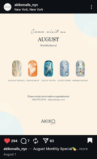 I've been getting regular manicures for over 15 years and my experience at Akiko has by far been the worst. I'm incredibly disappointed with the quality of the manicure + art, and the subsequent disrespect and mistreatment I experienced from management. I'm including more details below in case anyone is interested, but in summary there are many great salons and nail art studios in NYC, and I would highly recommend looking into other ones before booking an appointment at Akiko.