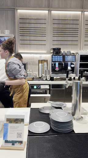 One of the coolest things about the lounge is the cafe and bar area. They have freshly made pastries and croissants that are buttery and crispy, and they also have a juice shot and chia seed pudding. The baristas make a fancy espresso drink with latte art, which was a hit with me since Iām a big cafe latte fan. The cafe latte at the airport is always over $6 in a paper cup, but here I could have it in a nice coffee cup. They also have auto espresso machines for cafe lattes, but itās not the same, so I didnāt mind waiting in line.