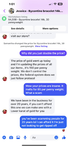 Read moreItems are very overpriced - more than double what they are actually worth in gold. I was interested in a 14kt bracelet listed for $2850 but after I expressed my interest, Samantha increased the price to $4500. She then tried to insult me, suggesting if I couldn’t afford it I should get one with a lower karat of gold. Stores like this give jewelers a bad name.
