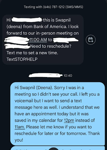 The real humiliation took place the next day. After taking a long break from work and waited 20 minutes at the bank, I discovered Swapnil wasn't even there. When I politely asked a staff member named "Luis" about her, he said she took an entire day off. I then asked why she would schedule an appointment on a day she was off, Luis suddenly looked really upset, raised his voice at me and enunciated, "SHE HAS AN EMERGENCY. YOU DON'T KNOW WHAT HAPPENED. I HOPE SHE'S OKAY. GOD BLESS HER AND HER FAMILY." I was left standing there, stunned and publicly shamed for asking a standard question. He seemed to have had a bad day but am I supposed to be extremely understanding when Swapnil lied about the time, rescheduled and then cancelled on me without any notice? And she just happened to have an emergency on the day before a long weekend?