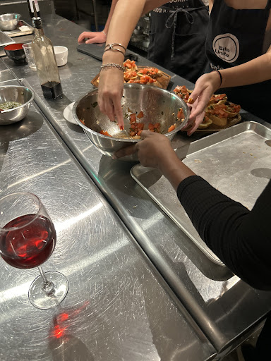 With this class, you're really making pasta from scratch. We started with just flower and eggs, and they walked us through turning it into the proper dough. While we let the pasta rest, we split up to do other prep work. Some of us made a pesto sauce, while others made the ragu. We ended up making bruschetta which was DELICIOUS. Once we all finished that, we got back to the pasta and began making the actual noodles. This all is part of why I loved the experience. Initially, we thought we were only making our own servings, but we found out that everyone was cooking for each other. It was a wonderful feeling seeing that we all literally made our dinner from scratch. I liked the fact that we had made two types of sauces for the pasta, so that there was variety for everyone.