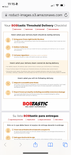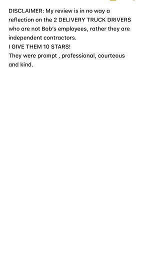 Read moreI realize that all of the 1 star reviews are from the same store. The Bob’s Discount store in a minority neighborhood. The same place I purchased my furniture. But my horrific experience occurred with a delivery person B. Diaz. He refused my job without even communicating with me. I mean nothing, zero, zilch. So rude and unprofessional. Came in, scanned the room and left. I’m moving my furniture in the hallway to make it easier to deliver my bedroom set and after an hour waiting, I called and found out he cancelled the delivery. And I’m disabled. Didn’t say a word to me. First of all, it appears bogus to me because the tracking showed he had over 11 deliveries. If the alloted time is 2 hours per delivery, was he working 22 hours a day? He didn’t have enough time in the day to make all those deliveries. And I wasted 2 hours on hold talking to 3 reps and 3 supervisors in Guatemala who did nothing but lie to me. The reps were professional but one supervisor chastised and blamed me and the other 2 just told me what I wanted to hear to get me off the phone. Promised same day re-delivery. Don’t believe it. The entire ordeal was stressful and I’m gonna take it to the CEO of Bob’s. I know poor Customer Service is the norm these days but it shouldn’t be. Now I have to wait a week with my apartment in chaos before I can return things back to where they belong.