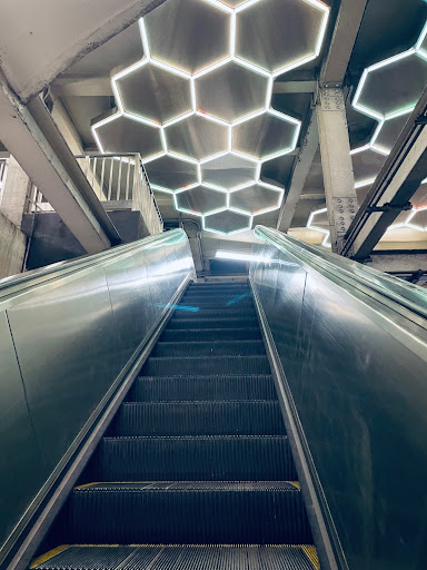 Glass, steel, ceraminc, and lighting. Stainless steel and glass sculptures on the mezzanine columns; plus ceramic tiles on the...