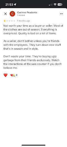 I’ve also attached a screenshot of another review that perfectly reflects my experience. No matter how nice your clothes are, if you’re not friends with the staff, it’s nearly impossible to sell anything. They’ll tell you your items aren’t in style and Honestly, I’m sure they’d say the same even to someone working in fashion.