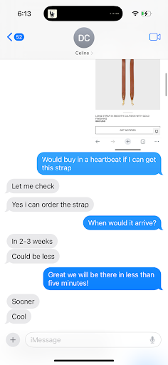 Weeks passed with no update. I finally reached out two months after the strap was supposed to arrive, and they told me they’d look into it. A week later, I followed up again, only to be told the strap was no longer available in the U.S. and that I could try calling other stores globally. I managed to track down what appears to be the last strap in the world (in Australia)—which was defective—but I was desperate. I asked Celine if they could help me get it shipped to the U.S., especially after I had done all the legwork. Their response? They can’t help and will only refund the original strap.
