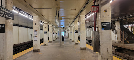 Chambers Street on the BMT Nassau Street Line is located at the intersection of Centre and Chambers Streets beneath the Manhattan Municipal Building. The station has four tracks, three island platforms, and one side platform (originally two).