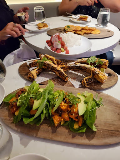 My co-worker was staying in the hotel and we popped in to grab something lite to eat after a work team event, fully expecting the usual bar fare (we went into the area just off the lobby, not the larger area where the live music is). When the food came out we were so pleasantly surprised, and over the moon once we started eating. There were 4 of us, we ordered 4 small plates. The wrapped chicken came on a nice wood paddle and there were 5 perfect wraps. We expected tiny bar size bites, but these were bigger. It took 4-5 bites to eat one, just to give you an idea of size. SO GOOD!! We also ordered the poké, which came with a beautiful puffy rice "sheet". The tuna was fresh and delicious and plenty for 4 people. Next was the Truffle Potato Fripps - nicely seasoned, very nicely sliced, like an au gratin. You were biting into an actual piece of potato, not something thin like a chip. Several slices on the plate and plenty for 4 people. Lastly was the Corn Ribs - holy cow... !!!! Mexican style elote street corn - grilled and charred to perfection, but instead of the entire cob being served, it was quartered, which gave it the "rib" look. The corn was not over or under cooked. It was perfection, cooked yet still had a crisp to it. WOW were they good, and the presentation was clever. Anytime I'm in the area and want something lite yet flavorful, I won't hesitate to stop in again. In fact, I work a few blocks away and wouldn't hesitate to stop in and have dinner for one. I want to try the main/large plates now!!