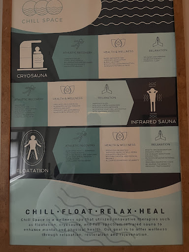 Read moreI just had a huge store visit and have been super stressed. I found Chill Space and could not believe floating tanks even existed! It’s like going back to the research of John Lilly back in the day around isolation tanks. I bought 3 services to get the 25% off in one day, and they helped me re-arrange the order so flotation was last. I definitely sweated out toxins in the sauna, and the lighting was really nice. Then I got my facial done which felt so nice and cool after the sauna. Tal was very professional and gentle. Then I got to the big finale: the float tank! Not as scary as I thought; my body just ... floated. So relaxing. I did not fall asleep but just changed positions throughout; 1 hour was the perfect amount of time. Tal was my assistant and did an amazing job answering questions, and I will definitely be back! Too bad I had to walk outside back to the smoggy...