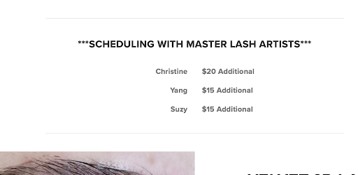 On their website, they advertise lash extensions, but there's a section called "Master Lash Artists" where they highlight three technicians, stating you have to pay extra to book them. When it comes to beauty services like lash extensions, I prioritize quality above all else. It's concerning that you have to pay more for supposedly superior service, especially since this is a new policy. To me, paying extra to get a top-rated master technician doesn't make sense, especially when there are technicians who work there but aren't considered masters, yet the prices on the website don't change. You pay the same amount for each type of lash extensions you get, regardless of whether it's a master or another technician.