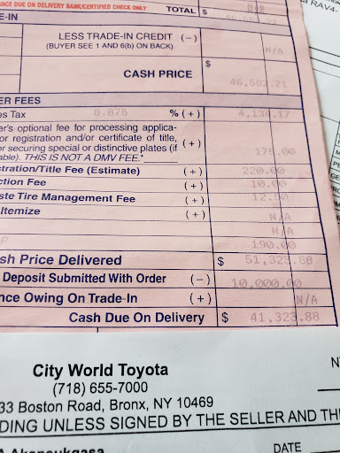 Read moreThis is the first time in the 13 years that I have been doing business with Toyota dealer with (7 brand news car purchases and 5 cars trade- in) That I have been forced to give a bad review to a Toyota Car dealer. City world Toyota to my knowledge is the worst and most dishonest dealer I have ever dealt with. Even to my enemy I do not recommend this dealer because the lack of transparency on the contract column, fraud and the falsification of sales price were the methods used by tis dealer to inflate the total cost of my car loan. The facts: I went at the service department with my 2019 Toyota Highlander XLE and during the service I was approached by Alfred Tavarez regarding the new 2023 Toyota Highlander my son and I was thinking about to trade-in at Hackensack Toyota because that's where I bought the car in March. 2020. The sale person starts the process and then brough me to the sale department which located 1 and half mile from the service department. The dealer offers me $21,500 for my 2019 Highlander the balance I owe was $21,632. I accept the deal, and this mean it is only $132 they will report to my new loan balance. I co-sign the contract with my son who has an excellent credit. Alfred Tavarez introduces us to Miss Yameline the finance manager. I spend almost 4 hours in this dealership and the contract was submit to me to sign trough the phone screen just to hidden me the details of the contract, we sign the contract and the next day one of my friend who use to work at the Toyota dealer came to my house and review the details of my contract and told me that I was scammed by the dealer and that it was it like I just give for free my Toyota highlander 2019 to the city world dealer and I am still have to paid the full balance because they reported the remaining balance of my 2019 Highlander to the new loan balance. I was very shocked and immediately I went back to the dealer speak to the Finance manager to point out the issue on the contract without being convinced by their contradiction explanation. This new car will cost me a total of 82.697 which goes beyond the real price for Toyota Highlander XSE 2023. I bring the matter first to NYS department of consumer affairs and then to NYS attorney general office consumer fraud protection without success because the dealer refuses to assume. Now I will fill a complaint to Civil court and at the same time I will alert the press in local news to draw attention to people to be careful when they are dealing with this kind of dealer who just think about their profit. It is sad that New York Law let those kind of auto dealer scammed peoples. I am determined to fight hard to restore this injustice. I am African and not fluently English speaker that why this dealer took advantage of to abuse on me in a contract by manipulating the amount. I would never recommend this dealer to anyone stay away and don't never try to trade in your car with...
