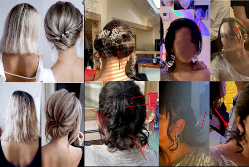 She was unable to either style or curl my daughter's curtain bangs. She burnt my ear. I had to do my own bangs as telling her I wanted them straight simply wasn't "registering". Not only was she unable to deliver anything that looked even remotely like the pictures we agreed to, but the hairdo looked like a kid's painting, where they just randomly brush in different colors across the page. Hair was pinned up in every direction, pins were showing. Crystal pins that I bought fell out within 30 minutes and the do itself was destroyed within hours of the party starting.