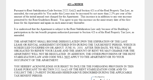 The rider is one page in a 50+ pages lease docs package, Iâve attached a screenshot. Since July 2023 (year 13), the building has been applying 421a surcharges on renewals. Basically this bullet is applicable: â421-a tax abatement for 20 years - the phase-out surcharge collection of 2.2% begins in year 13, eight increases, total surcharge not to exceed 17.6%â (google for source, google reviews not letting me put in links)