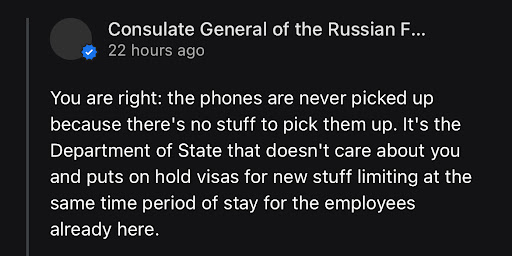 Read moreOnly one star people they need to get new workers because all the people that work there are really rude and don't really help. They answer the phones once at 100 times you try to call. When you make your appointment to come in and do your passport you get a email about bringing money order but they don't remind you about bringing envelope to send it back to you. When I came to do my passport in the Russian embassy The first thing I see is two ladies sitting in the chairs and just chatting not doing the work when the phone was ringing. I forgot my envelope and they make me go to Post offices and get it in envelope it was ridiculous . It was 20 minutes before they close so I had to run to the post office. This should make a rule is to provide envelopes. I'm not saying you have to pay out of your pocket just make money order separately like $10 per envelope. Oh do some kind of payment system like give you $10 cash so you can get a envelope and send back to me my paperwork. If people forget. Other thing we had to stand outside It was so cold waiting for an appointment. My appointment was 3 PM in the mail they said come five minutes early. We did but we still had to wait another 25 minutes to get inside. And when they talk to you they need to speak up because you barely can understand one lady that works there that she's the older one. I couldn't understand what she was saying half...