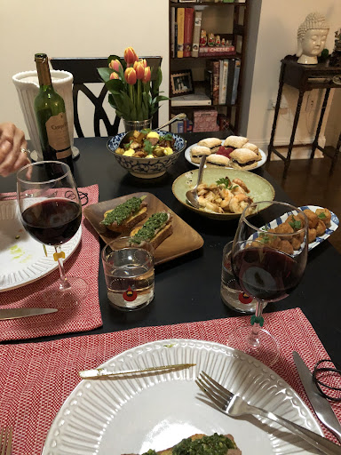 Emilee and I were warmly greeted at the door by Joaselyn and her amazing canine friend, Petra. Don't worry, Petra will go and do her own thing if you aren't into dogs, but we love animals, so she was an absolute treat. Joaselyn immediately made felt at ease. Her apartment is beautiful and welcoming. The table was set, there was a full menu on the fridge along with the steps. She gave us an overview of what we were to do and we were off.