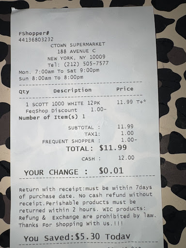 Read moreI went in for toilet paper and saw the Scott toilet paper on sale for $10.99 so I decided to buy it. I get to the register and tell the cashier that it’s on sale and to please use the store card. She scans my item and then the store card and I look up and see $11.99 instead of $10.99 so I ask her why and she says it’s the tax. I didn’t want a confrontation because I was very confused so I just gave $12 cash and left with my item, my change and my receipt.