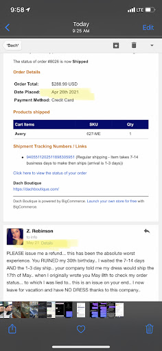 MONEY HUNGRY & TERRIBLE CUSTOMER SERVICE!!! I ordered a dress on March 3rd for my birthday from this “boutique” and I just got it yesterday May 20th. When I placed my order in March, the website said it would take approximately 7-14 business days to make and 1-3 business days to ship. I needed the dress by April 17th so that was more than enough time because my dress would’ve been shipped on the 23rd of March. Unfortunately due to the pandemic, this store had to close. Their last day being open was going to be the 22nd of March. I had to find this out via Instagram post! The only way to get in contact with someone is through Instagram DM! They do not pick up the phone nor do they respond to emails! When I saw that post, I reached out to them through Instagram direct message inquiring about my order the weekend before their closing and also one day before my dress was supposed to be shipped.In my initial encounter I was told I could either get store credit or wait until they reopen for my dress. I left it alone after that, but then I saw that they were still encouraging people to place orders on their Instagram and I questioned them about it. I was then told I could either get store credit or wait 20-25 business days instead of the original 7-14. I was FINE with that because it would’ve still arrived in enough time for my birthday. Anyways on the 25th business day I reached out again Via Instagram dm and was told once again that I wouldn’t receive my dress until they reopened. I spent $320 dollars on ONE dress from this boutique and I understand that the effects of this pandemic was no ones fault but I just felt as a BUSINESS, they should’ve made it their priority to reach out to their paying customers and let me know what the situation was and what their options were. If I hadn’t seen that Instagram post, I would have absolutely no idea what was going on and not to mention how I was knowingly mislead on more than one occasion. It is a BIG risk putting your money into this “boutique” I would HIGHLY not...