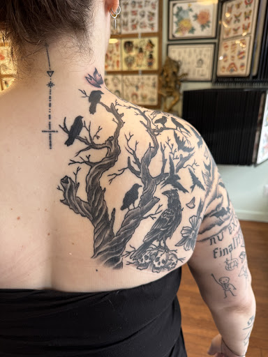 Feb 2025, I wanted some more permanent artwork of Jae’s before I left NYC. I went in for a consult and had a grand vision of several different ideas and didn’t know how to tie it all together. I knew I wanted half of my upper back, shoulder, arm and clavicle but was unsure of where all the ideas would go and fit together. I sat for 3 sessions to get this brilliant, beautiful design. Jae was excited and enthusiastic to share his ideas every time I came in for the next part, and I was so excited to receive this full piece. I brought several different ideas to him that I wanted to incorporate and not only did he create the most beautiful designs, but he helped me fully realize my vision and dream. The photos are from this recent large piece.