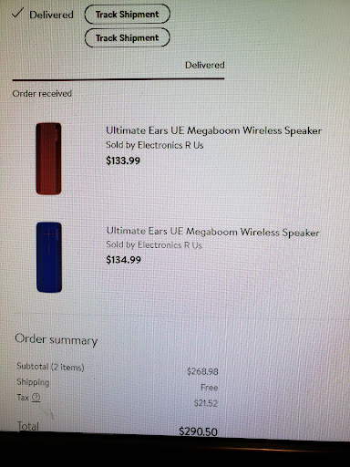 Read moreI placed an order for 1 blue and 1 red UE Megaboom Wireless Speaker Sold by Electronics R Us through Wal-Mart on March 17th. When I received my order on March 22nd, there was the red Megaboom but they sent a blue Boom2. I sent them a message and asked them to contact me about the mistake. After a week I send a second message and still no response from them. The speakers do not have the same response and therefore the true stereo sound is not there. If this is the way they do business I cannot recommend them to anyone that asks for my opinion of them. I certainly do not recommend them to anyone thinking of placing and order in the future. I have attached a photo of my order and a photo of...