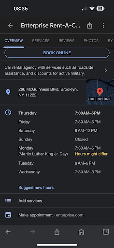 Read moreFew things make me as mad as companies taking advantage of good [return] customers, and this Enterprise location has finally crossed the line between what I'm able to turn a blind eye to. We've rented cars from them 3 times now.. something being slightly off each time. Once, we left the lot only to discover our rear signaling light was out. Had to waste time driving back, waiting for another car to be readied. Second, we reserved a car for as soon as they opened on a Sunday, showed up early, but had to wait an additional twenty minutes because they had to fill the tires with air... we had a reservation - you knew we were coming, why did you not prepare?! I considered those things minor annoyances, but most recently, we rented a car - drove up to Albany, parked it in a hotel parking lot overnight, and drove back the next day. Upon return, someone named Jordan, told us there was a dent on the passenger door. It was barely visible, in fact - in a photo we showed to several people - they didn't even see anything - but that's besides the point. We explained that it was literally impossible that we were responsible for this "dent" because in the 24 hours we had this car - the only place it was left on its own and susceptible to damage was in the hotel parking lot. Which - coincidentally - our spot was near a lawn/curb so there was ZERO chance that anyone could have dinged it on the passenger side by parking next to it. We held out hope that after leaving the grubby hands of one inexperienced employee in one location, we could reason with the claims department of enterprise. That was foolish of us - we were just sent paperwork... twice - duplicates, actually - because apparently efficiency is also a weak point of this company, in addition to just being greedy & full of BS, and then we were sent a bill for $300+. No further investigation, no acknowledgement of a dispute. Total garbage way to handle everything. I will 100% be advising everyone I know to steer clear of this place, will always choose AVIS/HERTZ at all airports, and will be using Silvercar (Northside Williamsburg) for any further rentals I need from North Brooklyn. If for some reason you MUST go here, document EVERYTHING. Take a video of the walk around the car, and take pics of everything - otherwise, good luck dealing with these liars and shelling out extra money...