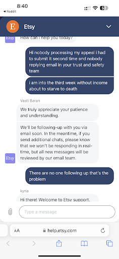 Horror story to follow. I originally was going to give one star, but there some some redemption by the end of my situation so they've earned another star. I bought an item from someone that was not custom made. It was listed as a size S/M, and I specifically told the seller that it was for an event I was attending on a Saturday (to verify whether I'd receive it before then). I was confused by the sizing, but the seller assured me that if I wear a size small or even an XS, this item would fit me. The seller had a shop policy of allowing returns on premade items (like mine) if they are contacted within three days of receiving the item, listed plain as day. When I received the item, beads immediately fell off of it upon opening, and when I tried it on, it was huge. The measurements were actually a bit odd, and it seemed like it was designed to fit a size large at the top. I contacted them immediately the day I received the item on a Thursday, asking for help. Rather than help me, the seller accused me of wearing the item to an event that day, and refused to refund me should I want a refund, telling me that they will fight any claim I make against them to keep my money. I was shocked and devastated. I worked up the courage to contact Etsy after that horrible encounter, and they told me to open a case. I did so, and Etsy did nothing. This seller faced no consequences for refusing to honor their shop policy and for treating me so horribly. They refused to review the case despite all the evidence and all the abuse I was subject to by the seller in the case log for simply providing proof of her prior abuse, the damage to the item upon arrival, her shop policies, the inaccurate sizing etc. This refusal was on the grounds that they "didn't have enough information" and therefore decided not to review my case at all and would not discuss the matter with me further. They showed no sympathy whatsoever for my situation, only apathy by shutting me down when I tried to communicate with them. I eventually got refunded outside of Etsy, but there was still the principle of shop policies being clearly violated, receiving a damaged and inaccurate item that I could not and did not wear to my event, a seller treating me horribly before I even had the chance to ask for a refund, and Etsy not showing the slightest sympathy. An Etsy representative later reached out, finally showing the sympathy my situation deserved, which made me feel better... but I believe this only happened because I filed a complaint with the BBB (in which Etsy continued to dismiss me and fail to properly read and address my complaint in the case log). They gave me a credit on my account, which I used to buy a cute item I had wanted from Etsy for a long time. Unfortunately, after this entire horrible experience, I believe that purchase was my last from Etsy. I remain shocked about what I had to go through to get human decency and a refund from this company and seller. I will never recommend Etsy to anyone ever again, despite having discovered and used Etsy years prior. I will only recommend small artists I've had good experiences with from now on, such as the person I got the cute item from, who hopefully sell outside the Etsy platform as well. I appreciated the gesture Etsy made after it was already too late, but it sadly wasn't enough to give me the confidence I need to shop there again. Beware of this site, and know that you as a buyer will NOT necessarily be protected by shop policies, Etsy will not care how a seller treats you, Etsy will not help you until they later realize they don't want more complaints or to lose your money forever, and you will have to fight elsewhere to get your own money back should you have an awful experience. Also be advised that they don't even have real customer service. None of their phone lines work-- you get disconnected or met with a brief robo-message if you even manage to find a phone number and try to call it. Their chat service takes dedication to unearth from their labyrinth of a help center. Emails or FAQs are the only...