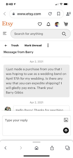 Read moreI shop at Etsy.com all the time! I usually have no problem Whatsoever when I purchase from vendors at the site! However on April 2 of this year I purchased a custom made ring from a vendor Helen LaCumiseta, who runs Unique History Shop on Etsy.com! This ring was supposed to be my husbandâs wedding band on April 17. This ring was absolutely beautiful, not to mention most of her products were absolutely beautiful! We specifically asked if we could get the order by April 17 due to the fact that we were getting married. She said the ring would be done by April 10 and if we purchased express shipping that it would be there by April 17. We were thrilled!So of course we purchased the extra shipping! Well April 17 came and went no ring! Of course I complained, she apologize, she gave us an option for return of our money or a replacement ring! My husband really wanted the ring so we took the choice of the replacement! She said she was already working on it! Well it took twice as long for her to make it this time and she told me on April 30 that she was done with the ring and that she was shipping it out express through DHL that same day and she will send me the tracking number. Well I received no tracking number and try to contact her again and again only to get the message that she was sorry she was on vacation and it was it generated message to like everyone! Now I had try to open a case with Etsy after the first ring came up missing when FedEx received it! Fed ex received an empty box when they picked it up which seems funny to me because FedEx doesnât usually stop business with someone for just received an empty box one time but thatâs what happened so they donât use her anymore. Etsy.com made me wait until the date they seem to fit for me to open a case! So here it is a month since my original purchase of the ring itself and the $29 plus tax 3 to 7 day shipping I have no ring, and I have no three today shipping! My problem is that etsy.com should handle things right away when a customer needs something done and they fail to do so! They should look into the problem right away not when it suits Them! You are a website that actually employees these vendors they are selling services to customers off of your website that means you are responsible for what comes off your website! You donât just sweep it under the rug! Now I want to give credit where credit is due, the agent that is helping me on the etsy.com website is excellent! He is going out of his way to try and get in touch with this woman who is probably avoiding him the way she is avoiding me! So I do think him for his effort! And I know there are rules he must follow he is not the owner so I do understand! I am just saying Etsy should have a better procedure when handling cases...