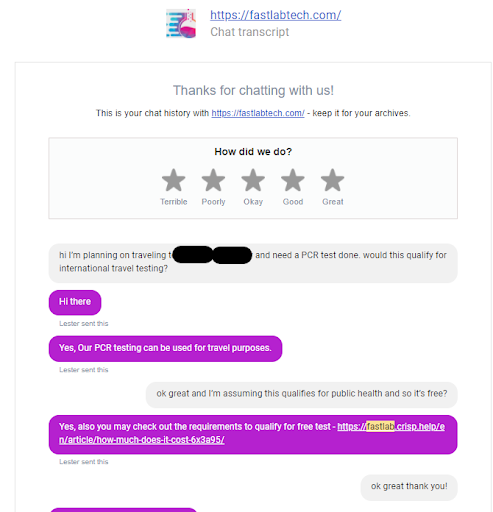 I was traveling internationally and needed a PCR test. I went to FastLab’s website and messaged their support chat to confirm that a PCR test for travel will be free. I even confirmed if travel counts as being asked to get tested by a public health department because that's part of their policy and the support agent confirmed without a single drop of doubt. (See attached picture for proof)