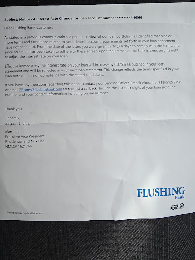 Read moreThis bank doesn't care about its customers, I took a commercial loan with them since 2022, I never had any problems until now, one of the requirements is to keep 3 times of the monthly amount into their checking account, but since we are in a very challenging economic situation right now one of my commercial tenant is having trouble making payment and one of the residential unit is vacant I still manage to pay them on time but instead of trying to help me I received a letter from Alan J Jin Executive vice president telling me that they will raise my interest rate by 0.375 which cause my payment to go up by almost $400 more every month. They're just trying to make it harder for me so they can foreclose the property. Not a Good bank to do business with, a bunch of greedy running that institution, please share that review everywhere for me as I will be posting it on every major social media site myself to warn any potential customers about...