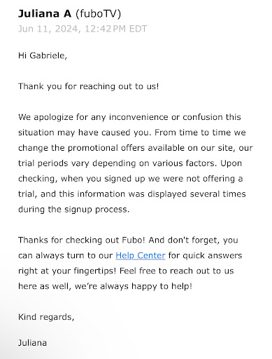 I wanted to share my experience using the app Fubo on my TV streaming. I first tried them in January they had a 7 day free trial so I got to watch a playoff football game for free. I made sure I contacted them a few days later to cancel the trial. It worked out great. Cost me nothing. I found they are so easy and pleasant to deal with. Then I found out earlier tonight there was a Bruins game on.fubo so I tried using the free trial again tonight but it was a one shot deal which is fine. I ended up sending Fubo an email because they still have one of my credit cards on file and wanted to make sure there was no charges to my card do to me trying the free trial tonight for the bruins game. I wasn't able to watch them which is fine. But like I said I wanted to make sure nothing surprised me on my credit card statement. These days you have to keep a step ahead of some of these companies. About 30 mins later my phone rang. It was Fubo. The App people for my tv. The service Reps name was Emma. She was calling me back to make sure all my questions were answered. She went thru my account and reassured me that I had $0 Balance on my card. I felt so much better just knowing I didn't have to worry about any surprises. But I was blown away that this company was caring enough to call me back for a couple of reasons. One was to confirm no charges were put on my card. But also explain about the free trial and how that works. I understood 100% the Rep I talked with was one of the most pleasant persons I've talked to in a very long time. The whole conversation was just incredible. First off. I wasn't expecting a call. But for them to care enough to call me and walk me thru everything went above and beyond. So I would absolutely recommend Fubo to anyone who may stream instead of pay these outrageous cable prices. I was paying over $200 a month for basic cable. With the streaming. I bought my own router/tower at Best buy so I don't rent it off Xfinity anymore. My bill is about $70 a month. For there internet connections. But that's going to be changing very soon. T Mobile is my cellphone carrier there going to start carrying my Internet for home and cell for about $35 a month. And that will Mean after almost 15 yrs I can cut the ambillical cord with Xfinity. Cable. I will be done with them. No more fighting about outrageous bills. Omg I can't wait. So in closing this email. Again I want to say Thank you Emma from Fubo for your kindness Saturday night. You proved to me there are still some incredibly nice people left here on this planet. I've been in such a miserable mood for months cause of health reasons. Fighting M.S. and it's been kicking my ass the past 6 or 7 months. Emma gave me hope. Showed me there's still very good people around. Ok I'm closing this email by sending it. I just looked at the clock and I'm in disbelief it's 3:57 am Sunday morning. I think it's safe I can go to sleep now. Good nite and God Bless Everyone. You to Emma. Your the best. Tom J. &....