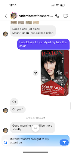 Fast forward like 3 days later my scalp starts scabbing all around BADLY! I also realized you can see the loop from the added hair in MULTIPLE braids in multiple parts! So I removed the braids and when washed I lost an excessive amount of hair. COME TO NOW FIND OUT.. dying and braiding your hair straight after is not safe! Which WAS NOT brought to my attention the night before when I explained to the owner I had JUST dyed my hair!! I bring it to her attention and she flat out says they did nothing wrong and feels like an apology is not needed on their end. I think the fact that dying and styling braids should have been explained to me prior? Or Iām bugging? She offered me a āfreeā treatment from a ālicensedā cosmetologist (which Iām declining because I will never let them touch my hair again!) I avoid braid shops for these reasons....
